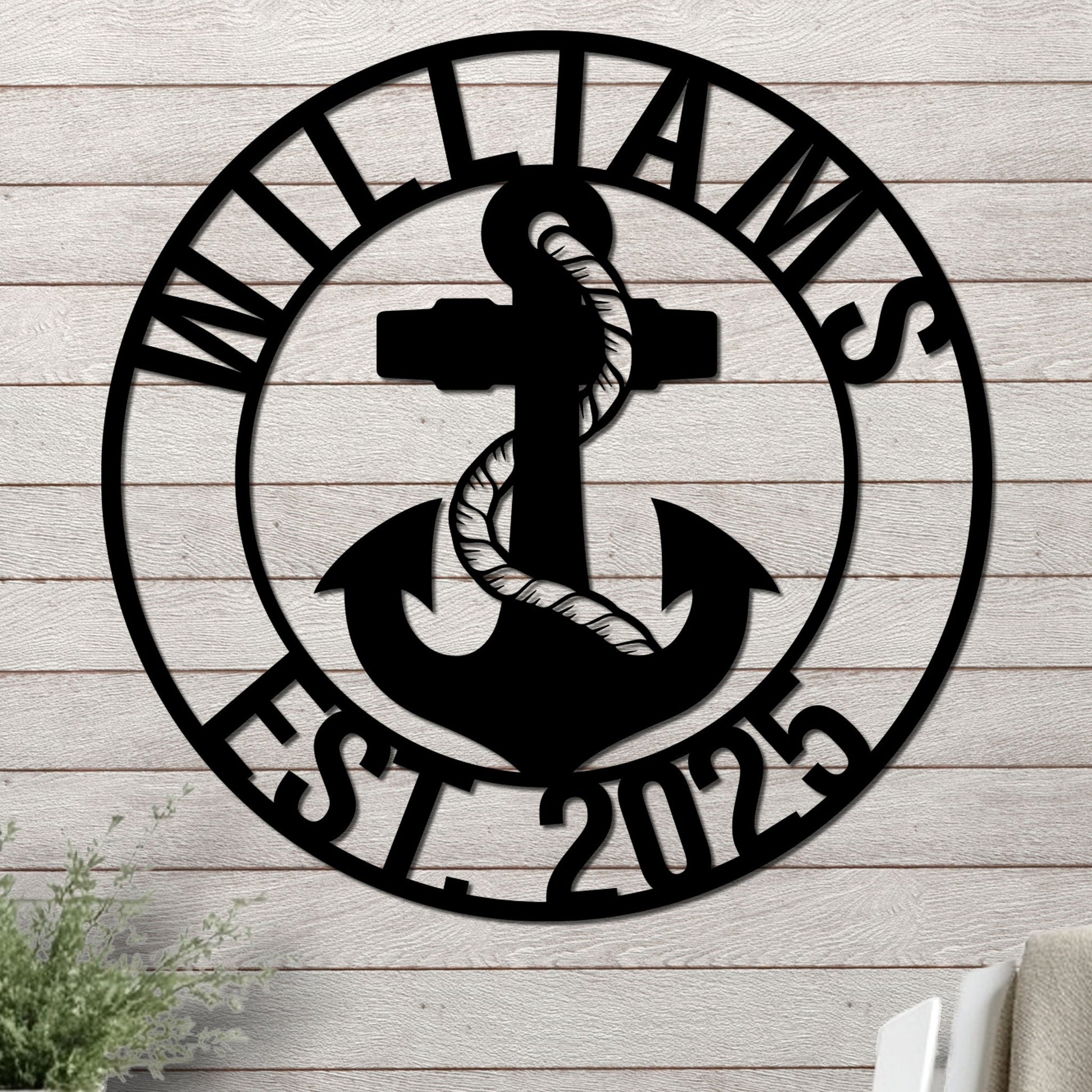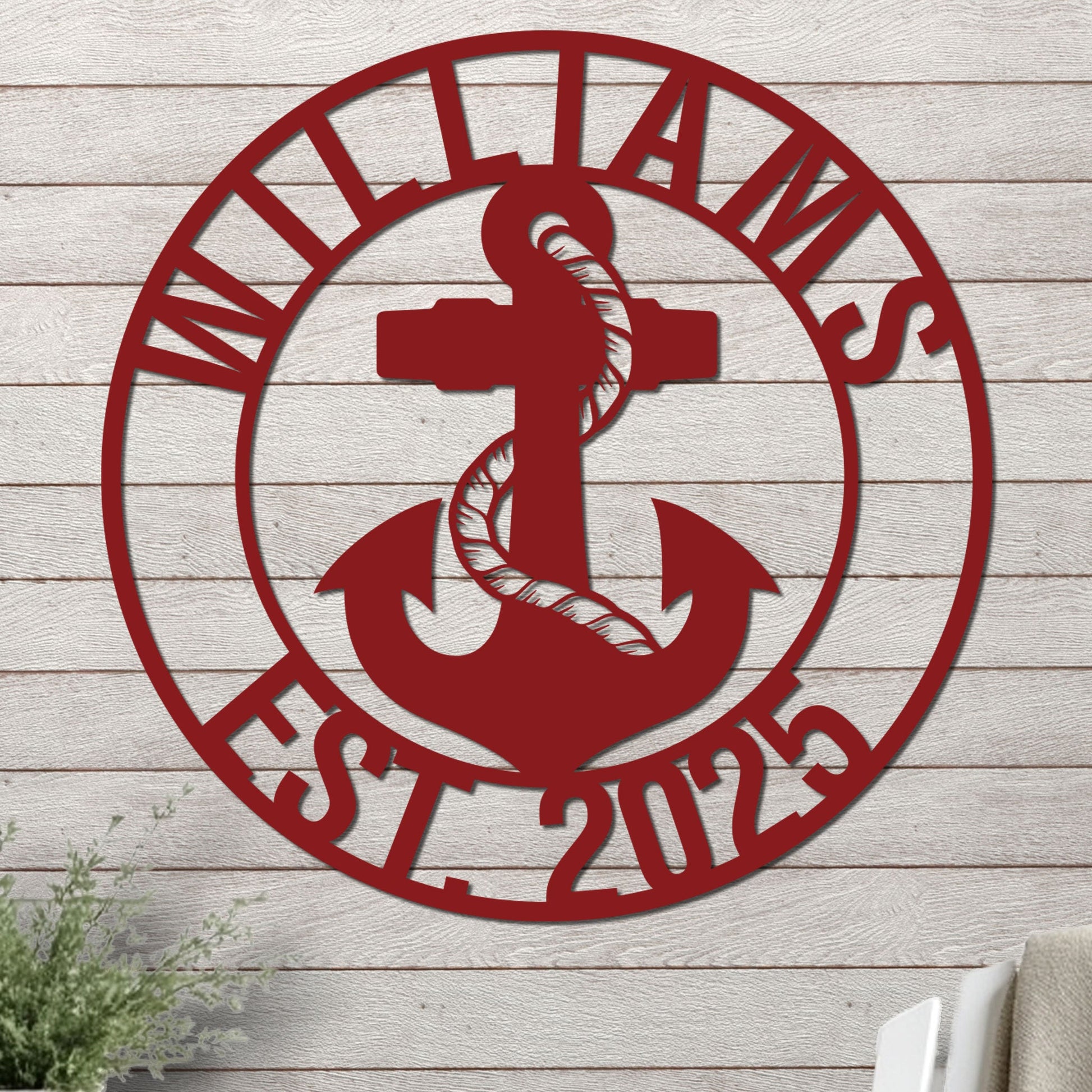 The Name and Year sign featuring an Anchor Design is a versatile decoration suitable for indoor and outdoor use. Crafted from sturdy 16-gauge steel, this sign is coated with premium-grade paint to enhance its longevity and resistance to the elements. Its striking design makes it an excellent addition to any room, adding a personal touch to your space while celebrating important milestones.