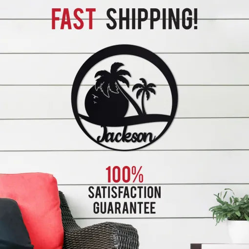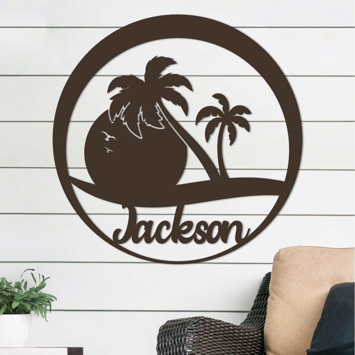 The Sunset Palms Name Sign is a versatile decorative piece suitable for both indoor and outdoor use. Crafted from durable 16-gauge steel and finished with premium-grade paint, this sign is designed to withstand the elements while maintaining its vibrant appearance. It makes a charming addition to any room, adding a touch of tropical flair.